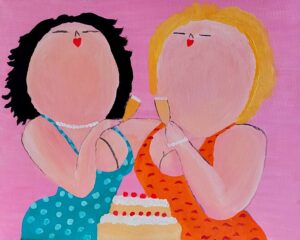 Dit vrolijke werk is door Marga Vlaar geschilderd: